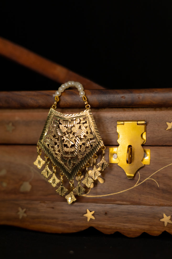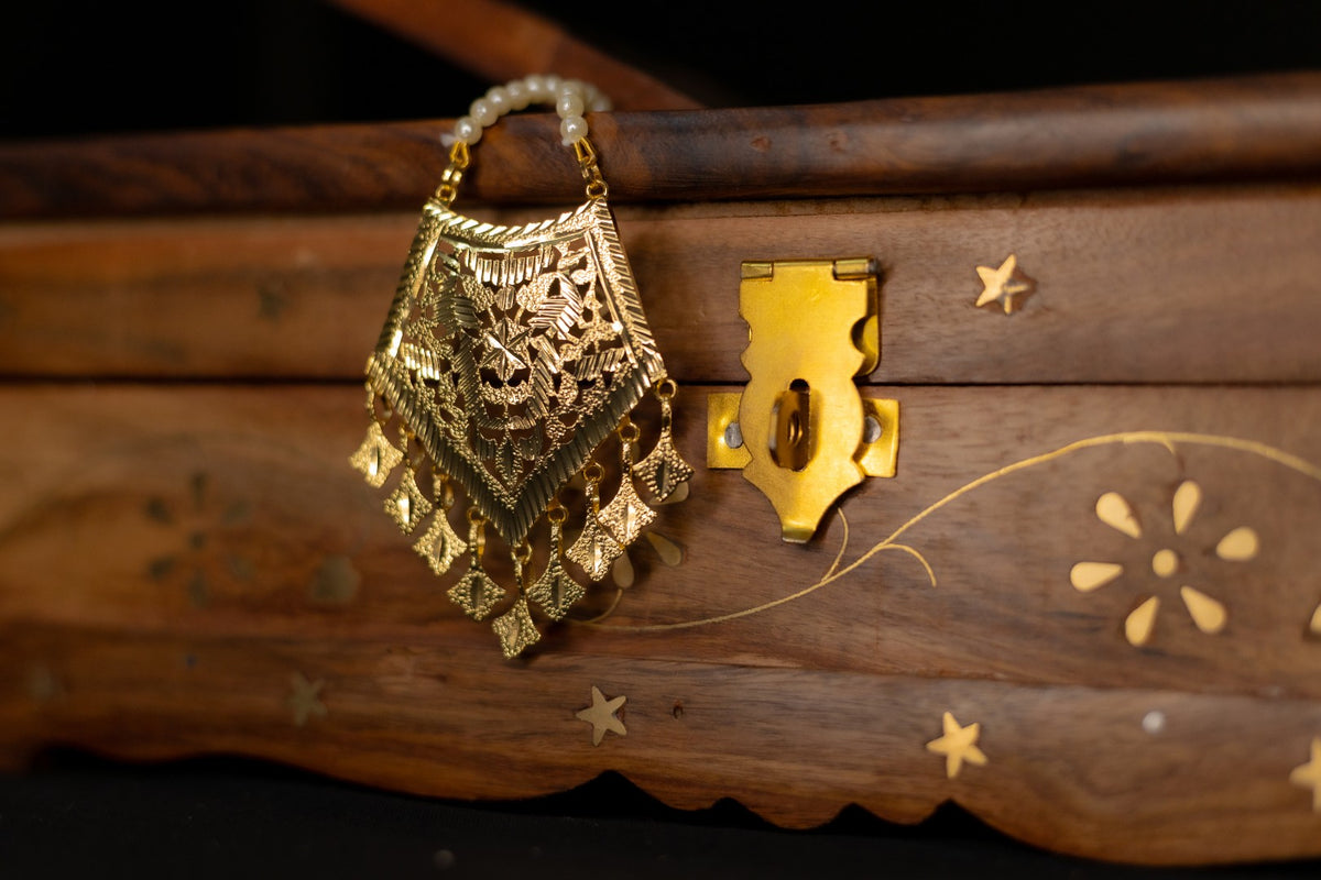 Celebrate the rich heritage of Punjabi jewellery with the exquisite Meher Set. This traditional Patra pipple patti tikka set showcases the beauty of jadau craftsmanship, making it a perfect addition to any festive or bridal ensemble. The Meher Set features an intricately designed necklace, complemented by matching earrings and a stunning tikka, all reflecting the elegance of Punjabi and Indian jewellery traditions. Handcrafted with precision, this set exudes a timeless charm that is sure to captivate and enchant.